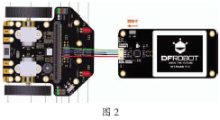 三、动手实践 准备好掌控板、NFC近场通信模块、麦昆小车、CR123A锂电池等材料各1个,将NFC近场通信模块连接麦昆小车超声波IIC口,绿色D/T接麦昆小车超声波接口D,蓝色C/R接麦昆小车超声波接口C,黑色GND接麦昆小车超声波接口-,红色VCC接麦昆小车超声波接口+,如图2。