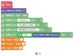 2.编写程序 基于上述编程思路,我们需要将初始化NFC模块接口I2C,变量forward、 stop、 biaoji和掌控板文字显示模块等放入初始化函数程序中,如图3。打开小车电源,掌控板屏幕依次显示“Mind+”“NFC麦昆小车钥匙”“等待接受NFC指令中……”等。