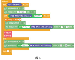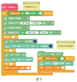 编写解锁小车模块程序,在Mind+软件指令区用鼠标点击“函数”;在“添加一个自定义模块”中,将函数名“积木名称”改成“车钥匙点火”;在“函数”指令区点击“自定义模块”;点击“完成”后,编写程序完成刷NFC卡实现麦昆小车启动、蓝灯闪烁3次以及按动掌控板A键使小车前进的功能,如图5。