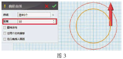 活动二:计算水管过滤器扳手尺寸 师:我们设计的模型要想应用于生活,就需要测量实物的尺寸大小,然后再根据测量的尺寸计算得到所要设计模型的尺寸。那么,请大家想一想,我们怎样得到水管过滤器扳手凹槽齿圈内壁部分的尺寸大小呢? 学生思考、讨论并回答。 师:由于水管过滤器本身呈圆柱状,这样我们使用软尺测量出的水管过滤器周长即为水管过滤器扳手齿圈内壁的周长,然后再根据圆形周长的公式计算出齿圈内壁半径的长度。经过测量,水管过滤器的周长是16cm,那凹槽齿圈内壁的半径是多少呢? 学生思考、计算,教师巡视指导。 教师总结:根据圆形周长公式C=2πr,我们可以计算出半径r的参数约为2.6cm。 活动三:设计制作3D模型 (一)画凹槽齿圈 1.将视图切换到上视图,使用“草图绘制”—“圆形”命令工具,在平面网格上单击创建一个草图界面,然后在Y轴上画一个半径为27mm的圆,单击确定。 注意:在Y轴上绘制圆形,就是将圆心落在Y轴上画圆,便于下一步的操作。在3D One中,计量单位为毫米,所以圆半径2.6cm可以换算成26mm;考虑到3D打印过程中有可能出现偏差,为了保证打印出来的水管过滤器扳手能够正常使用,我们在设置设计尺寸参数时,要尽可能比实际测量的数值大1~2mm。 2.使用“草图编辑”—“偏移曲线”工具,对圆形进行偏移,偏移距离为10mm,如图3,单击确定。