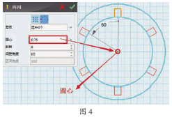 3.沿着Y轴画一条垂直线作为镜像线,然后使用直线画出凹槽图形的一半,其中,直线长度为2.5mm,然后再使用“基本编辑”—“镜像”工具对其镜像,删除镜像线,单击确定。 4.使用“基本编辑”—“阵列”工具,对凹槽图形进行圆形阵列,将数目设为6,间距为60mm,圆心为圆形的圆心,单击确定后,使用“草图编辑”—“单击修剪”工具,修剪多余弧线,如图4,单击确定。
