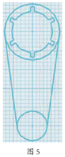 (二)画手柄和挂圈 1.在凹槽齿圈正下方画一个半径为20mm的圆,然后使用直线将凹槽齿圈外圆和下边的圆形连接,如图5。然后借助于“草图编辑”—“单击修剪”工具,修剪掉草图中多余部分,单击确定。