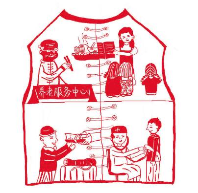 老有所养 小康生活意味着老有所养、幼有所教、劳有所得、病有所医,小康生活给人们带来了幸福快乐。这幅作品主要参考了中国传统文化中的剪纸艺术,利用红与白的交相呼应,更加凸显中国特色。