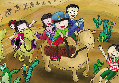 美好的假期生活 暑假里爸爸妈妈带我去沙漠旅游,我们骑着骆驼在沙漠里走了好大一圈,感觉很刺激。我想用画笔记录下这一精彩时刻,于是运用了Photoshop软件,在绘画过程中使用了基础线条、渐变、描边、图层、蒙板、涂抹等工具,其中涂抹工具让我轻松地画出了沙漠的效果。