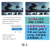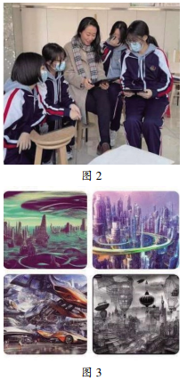 其中第二主题AI设计——畅想未来城市,教学目标是通过AI绘画工具,助力创意实践。教学重点为探索AI提示词,进行绘画主题表达。教学难点是完善提示词,优化AI画面出图效果。整节课经历了情景导入、走入AI、融合探索、创意实践、评价展示、总结提升六个教学环节。通过有效的教学活动(如图2),学生以饱满的情绪体验创作乐趣,上机实践完成了AI作品(如图3),并将AI作品作为素材进行创作草稿。