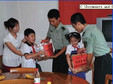 ▲在第八十三个建军节到来之际,南京市玄武区宇花小学刘彦校长、王成副校长等一行人先后到军区直工部、装备部、训练大队、总站等共建单位进行了“八一”慰问,表达宇花小学全体师生对部队官兵的深情厚意,受到部队官兵的热烈欢迎。图为学生代表向武警官兵送上慰问礼物。