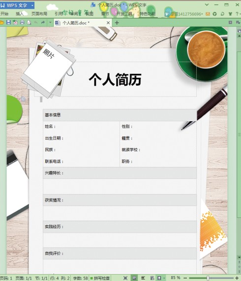 第一步,在WPS中下载一个简历模板,按要求填写好个人简历,如下图所示。