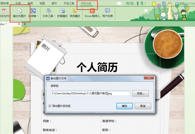 第二步,在菜单栏中“特色功能”的下拉选项中选择“输出为图片”,将图片保存到桌面,点击“确定”,如下图所示。