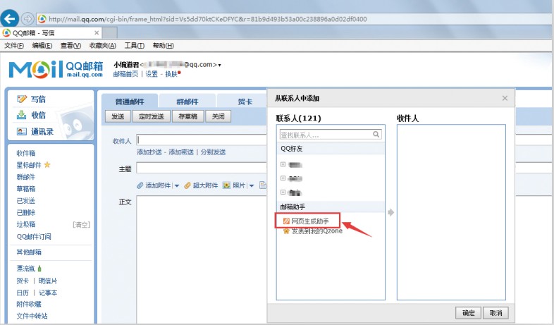 第三步,打开QQ邮箱写信,点击“收件人”,在弹出的对话框中选择“网页生成助手”,点击“确定”,如下图所示。