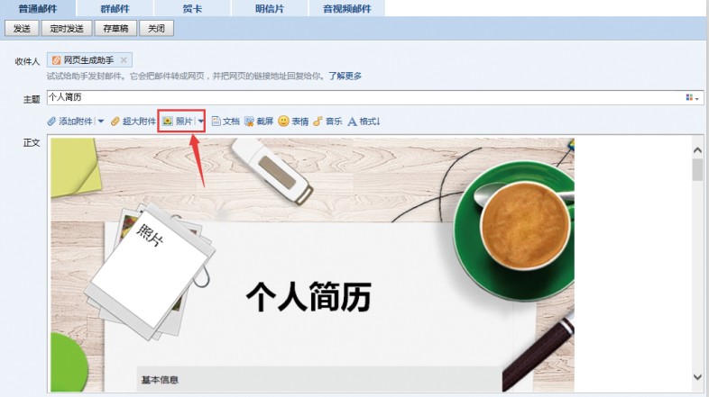 第四步,编辑邮件正文,将第二步中生成的简历图片添加到正文中去,同时,同学们可以根据个人情况自行添加一些展示个人才能的图片或文字,如绘画才能、音乐才能、写作才能等,如下图所示。