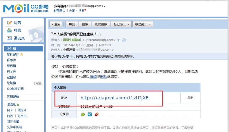 第五步,编辑好正文后,点击“发送”,5秒钟左右你就会收到一封回件,打开邮件,点击正文中显示的链接,即能得到一个网页版的个人简历,如下图所示。