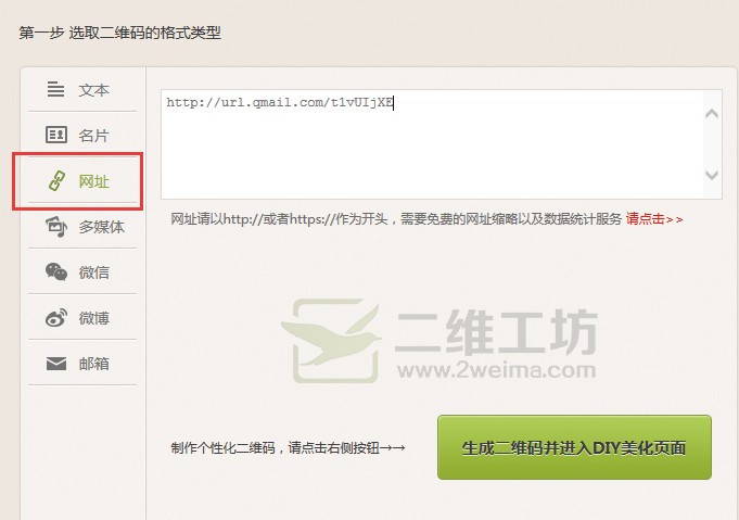 第六步,打开一个二维码生成网站(网上此类网站很多,这里我们以“二维工坊”为例),将第五步中生成的链接复制下来,粘贴到二维码生成对话框中,点击“生成二维码并进入DIY美化页面”,如下图所示。