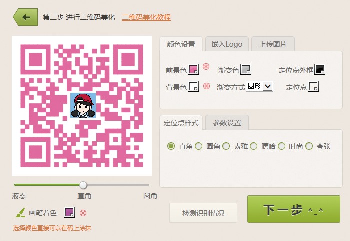 第七步,根据个人需求编辑“颜色设置”“嵌入Logo”“定位点样式”“参数设置”等选项,适度美化二维码图片,点击“下一步”,个性化的二维码就设置成功啦!如下图所示。