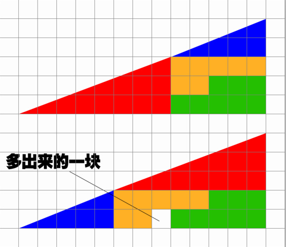 将4块拼图按照第一幅图组合在一起,正好拼成一个直角三角形,但是若按照第二幅图的拼法,却多出来一块空白,亲爱的同学们,你们知道这是为什么吗?