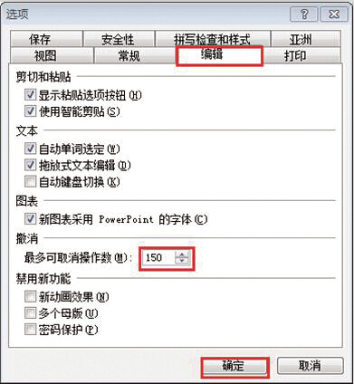 在制作PPT时,同学们如果因为粗心而造成操作失误,那么只要单击工具栏中的“撤消”按钮,即可恢复到操作前的状态。然而在默认情况下,最多只能够恢复最近的20次操作。其实,PPT允许“反悔”多达150次,但这需要进行如下设置:“工具”→“选项”→“编辑”,将“最多可取消操作数”改为“150”,点击“确定”按钮,如下图。