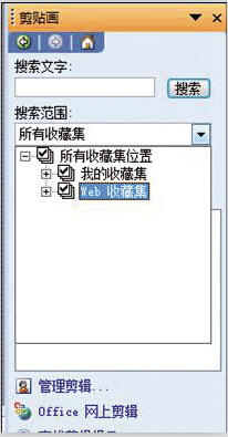 同学们经常需要寻找图片来作为PPT的铺助素材,其实此时不用登录网站去搜索,直接在“剪贴画”中就能搞定。方法如下:菜单栏中“插入”→“图片”→“剪贴画”,找到“搜索文字”一栏并键入所寻找图片的关键词,然后在“搜索范围”下拉列表中选择“Web收藏集”,单击“搜索”即可,如下图。这样一来,所搜到的都是微软提供的免费图片,更不会涉及侵权事宜,同学们可以放心使用。