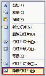 对于制作好的幻灯片,如果同学们希望其中的部分幻灯片在放映时不显示出来,只留作修改时观看,我们可以将它隐藏。方法是:在普通视图下,选中左侧的窗口,按“Ctrl”键,分别点击要隐藏的幻灯片,单击鼠标右键,在弹出的菜单中选择“隐藏幻灯片”(此时幻灯片序号上会出现方框和斜划符),如下图。如果想取消隐藏,只要选中相应的幻灯片,再重复上述的操作。