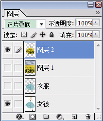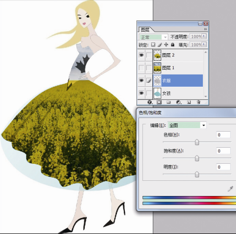 8.如果为了追求更逼真的效果,我们可以还原衣服的褶皱。选中“图层2”,将“图层样式”定为“正片叠底”。点选“衣服”图层,按快捷键Ctrl+U,调出“色相/饱和度”,不断调整“色相、饱和度、明度”,选择恰当的效果。