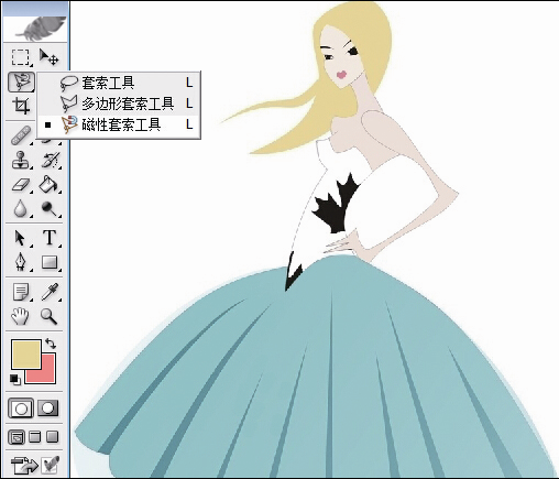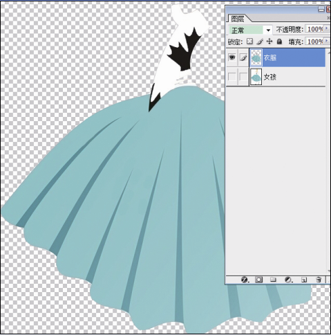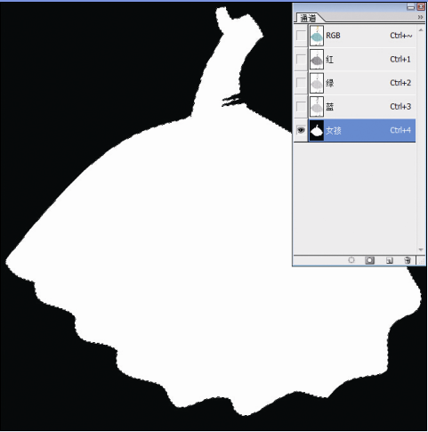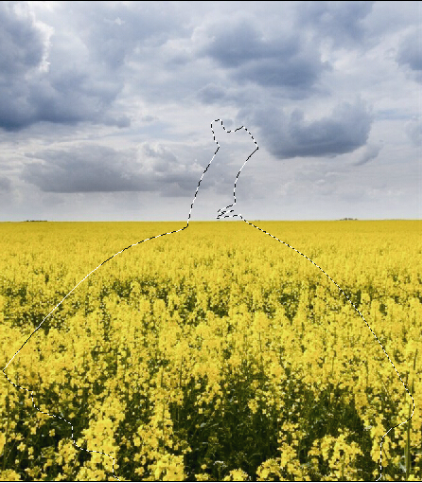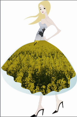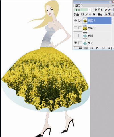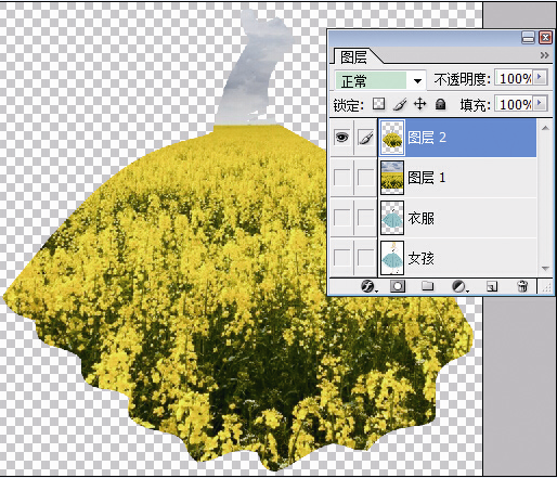 5.导入风景素材“兴化油菜花”,放在“衣服”图层的上方。选中“兴化油菜花”图层,按住Ctrl键,点选通道里的“女孩”,我们会发现风景素材上出现衣服形状的选区。