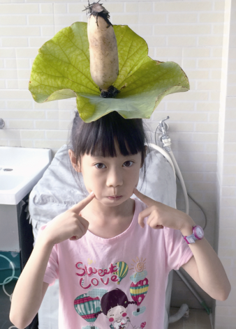 对面的朋友看过来,看过来!瞧我头上长出了什么?左看右看,上看下看,请不要不相信,对,这就是当季“最in”荷叶和莲藕头饰,还是限量版的!我是不是很酷呢!