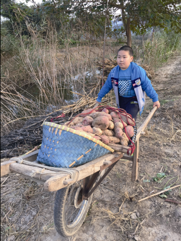 周末,我和奶奶去乡下一起干农活。不一会儿,我们就挖了一箩筐红薯。奶奶年纪大了,推车子的任务便落在我的肩上。瞧,我把小车推得稳稳的,奶奶直夸我干得有模有样。同学们,敢不敢来和我挑战呀?