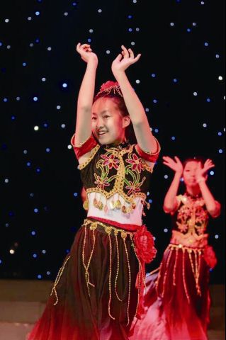 《新疆舞曲》的音乐响起,纤细的罗衣随风飘舞,优美的姿态飞舞散开,美丽的舞姿闲婉灵动,机敏的身体轻如风。