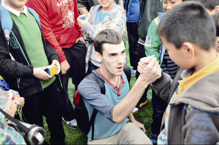 ▲参加省科技创新比赛时,我遇见了来自美国的交换生David。他和我们热情地打招呼,我们很快就成了朋友,还玩起了扳手腕。