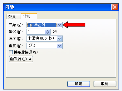 6.我们还可以设置开始时间,可以在鼠标单击时闪动,也可以在上个动画之前或之后闪动。