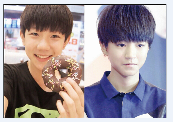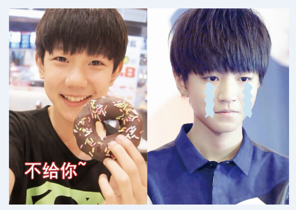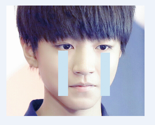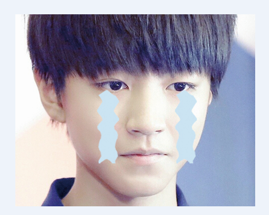 3.你用甜甜圈诱惑“我”,还不给“我”,王俊凯心中可谓无比悲凉。同学们想象一下,我们应该给他做一个什么效果呢?小编就给他添上两行泪吧!我们在工具箱中双击“设置前景色”图标,在弹出的“拾色器”对话框中设置前景色为较浅的蓝色。确定后在工具箱中选择“矩形工具”,在王俊凯的眼睛下方画两个浅蓝色矩形,将两个矩形所在图层分别命名为“眼泪1”“眼泪2”。