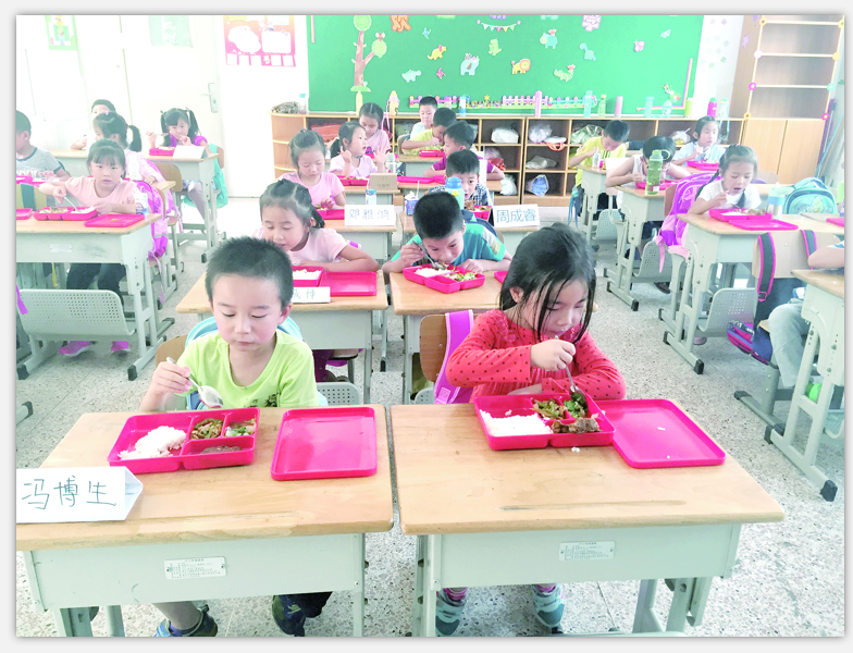 在幼儿园就餐时,饭菜由老师打好;而在小学,孩子们自己排队拿饭。红色的环保饭盒对他们来说是多么新鲜呀。一个小胖妞说:“老师,我奶奶可是大厨哦,可是学校的饭菜竟比奶奶做得都好吃。”听到这话,我不禁笑了起来,“学校的饭菜好吃吗?”孩子们竟都大声说:“好吃。”有的孩子还把吃得精光的饭盒向我“炫耀”。餐后,孩子们自觉地把饭盒放进保温箱,把自己的桌面收拾干净。这时一个小男孩跑过来,在我的左脸颊上亲了一大口,迅速地跑开了。我实在受宠若惊,这群孩子真的是出乎我的意料,他们活泼开朗,天真可爱,少少的任性,多多的自律。