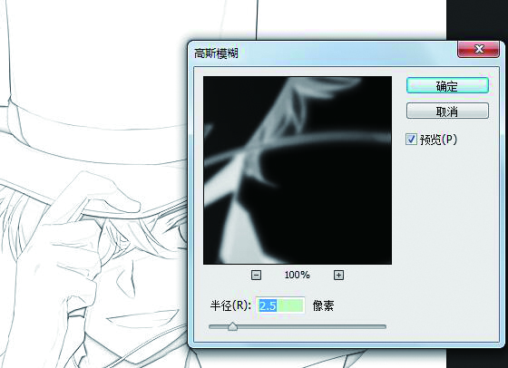 4.然后我们选择“滤镜—模糊—高斯模糊”,根据需要调整数值,小编将“半径”调整为“2.5像素”,点击“确定”。此时,一个大致的线稿就出来了。